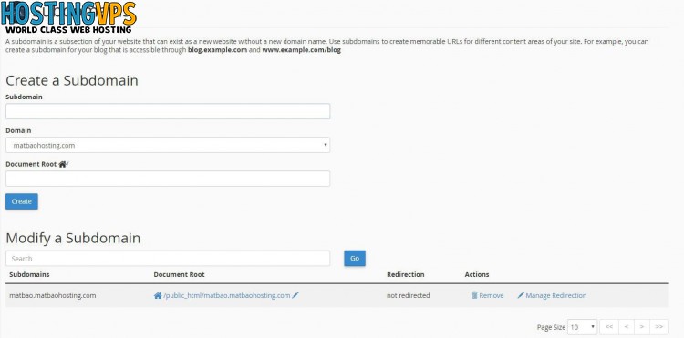 Sau khi khởi tạo thành công một subdomain thì tên miền con này sẽ được liệt kê vào danh sách bên dưới, quý khách nhìn sang bên phải của mỗi dòng sẽ có chức năng tạo Manage Redirection và xóa subdomain. Nếu quý khách muốn xóa tên miền con vừa tạo thì quý khách nhấn vào link Remove, nếu quý khách muốn tạo chuyển tiếp từ tên miền con này đến một địa chỉ khác thì quý khách chọn Manage Redirection.
