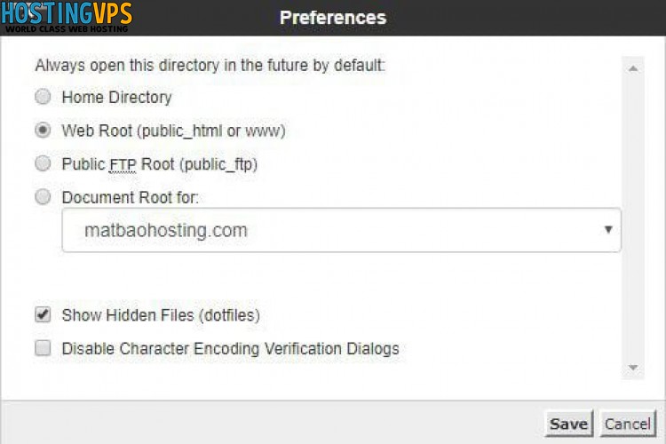 Sau đó quý khách vào Settings, hãy chọn là public_html/www (tức là các lần truy cập tiếp theo quý khách sẽ vào thư mục gốc trên host) và Show Hidden File (hiển thị các file ẩn như .htaccess).