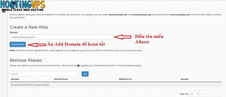 Để tạo một Alias Domain , nhập tên miền của quý khách vào ô Domain và ấn Add Domain như hình dưới:
